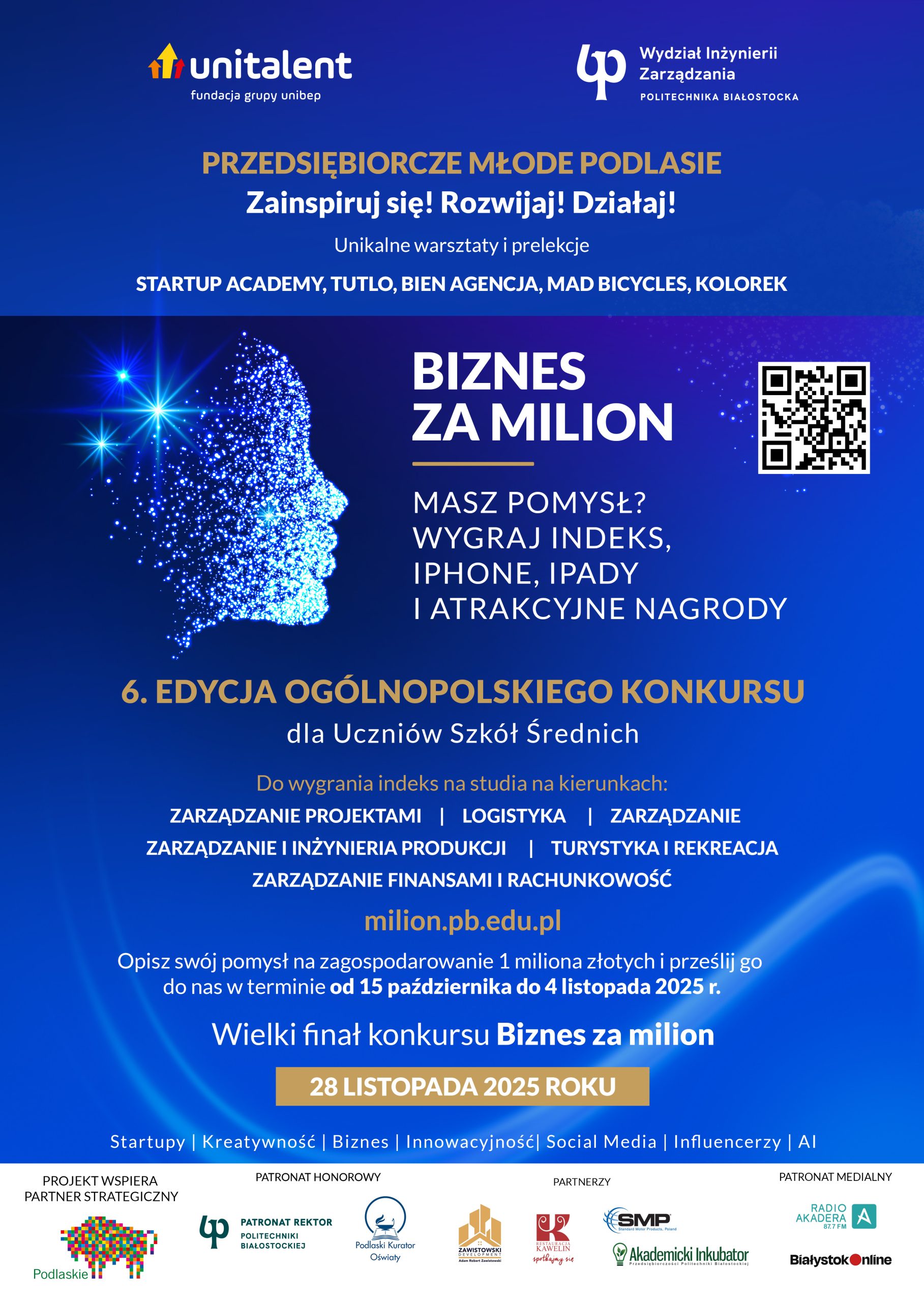 W tym roku konkurs jest realizowany w ramach projektu „Przedsiębiorcze Młode Podlasie”. Przygotowaliśmy także warsztaty dla uczniów szkół średnich, które poprowadzą znani specjaliści w dziedzinie kreatywności i przedsiębiorczości. W dniu finału 28 listopada 2025 r. swoją wiedzą i umiejętnościami podzielą się między innymi: Karol Stefanowicz – KOLOREK, Konrad Kaczmarczyk – STARTUP ACADEMY, Adam Zdanowicz – MAD BICYCLES, Wojciech Biendzio – BIEN AGENCJA i Tomasz Jabłoński – TUTLO.